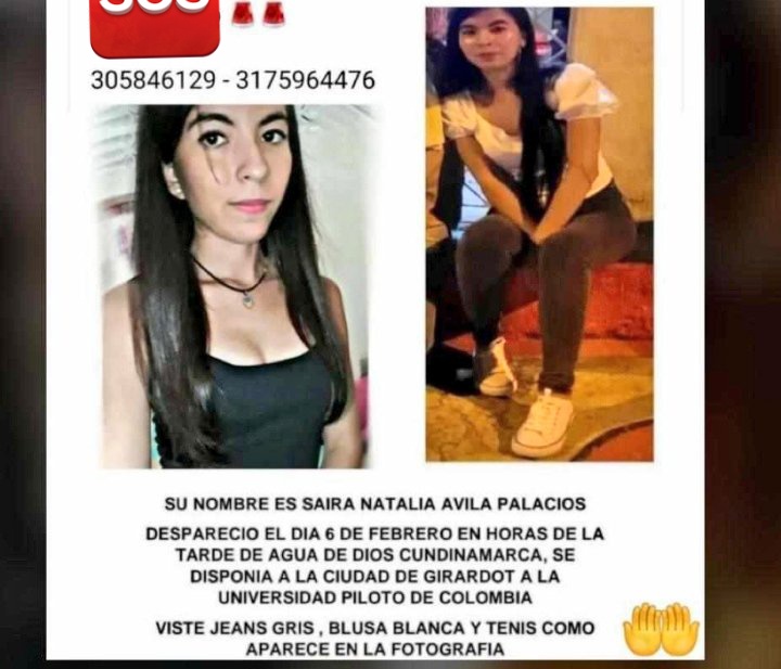 La familia de Saira Natalia Ávila Palacios está desesperada tras su desaparición el día de ayer 06 de febrero de 2023. La joven se movilizaba entre los municipios de Agua de Dios y Girardot cuando desapareció. Se les ruega a todos difundir la noticia para buscar alguna información acerca de su paradero.